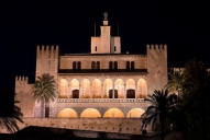 Palacio de la Almudaina Edificio de origen romano, que sirvió de residencia a los valíes musulmanes. La entrada principal del palacio de l'Almudaina accede al Pati del Rei o d'Honor. Aquí se encuentra la Capilla de Santa Anna, de principios del siglo XIV y atribuida a Ponç Descoll. El portal de la capilla gótica es de tradición arcaizante románica, con arquivoltas de medio punto sobre capiteles esculpidos con escenas de animales fabulosos. Del oratorio del palacio destaca la Capilla de Santa Praxedis, bajo una imagen que se remonta a 1458, y el salón del tinell, o del trono, del siglo xIV, con grandes arcos diafragmas apuntados, sobre los cuales se apoya una cubierta de dos vertientes, de idéntica factura que la del palacio de los Reyes de Mallorca en Perpiñán. |